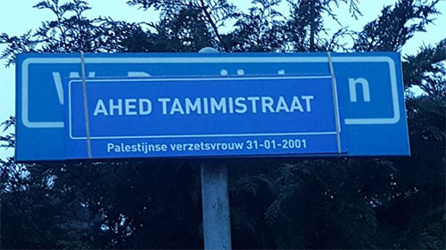 Activistas holandeses armados con pancartas y letreros callejeros cambiaron el nombre a múltiples carreteras en varias ciudades de los Países Bajos, con el de “Ahed Tamimi Street”, como gesto simbólico de solidaridad con la adolescente palestina encarcelada por el régimen sionista.