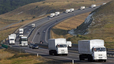 El convoy, formado por unos 280 camiones Kamaz, había partido el 12 de agosto de la provincia de Moscú rumbo a Ucrania con un cargamento que incluía 400 toneladas de granos, 100 toneladas de azúcar, 54 toneladas de fármacos e instrumental médico, 12.000 sacos de dormir y 69 generadores eléctricos para la población del este de Ucrania.