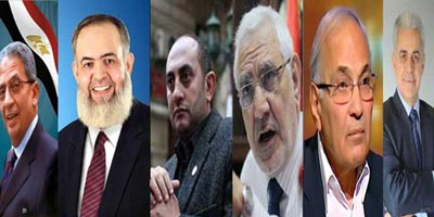 En las últimas semanas los candidatos viajaron a través el país desde el sur al norte en reuniones populares intensivos, debates y conversaciones, entrevistas, periodistas de la televisión en un clima de competencia política no podría haber sido concebido en la era del ex presidente. Entre los candidatos más prominentes, el candidato islámico independiente Abdul Monem Abou Foutuh, y el candidato de la Hermandad Musulmana, Mohamed Moursi, y Hamdin Sabahi del movimiento Nasiri, el ex secretario general de la Liga Árabe, Amro Moussa, y el último primer ministro de la era de Mubarak, Ahmed Chafiq.